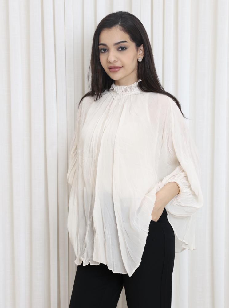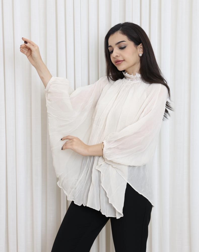 - بلوزة بيضاء سادة سهلة العناية بها، مما يضمن لكِ الاستمتاع بها لفترة طويلة.